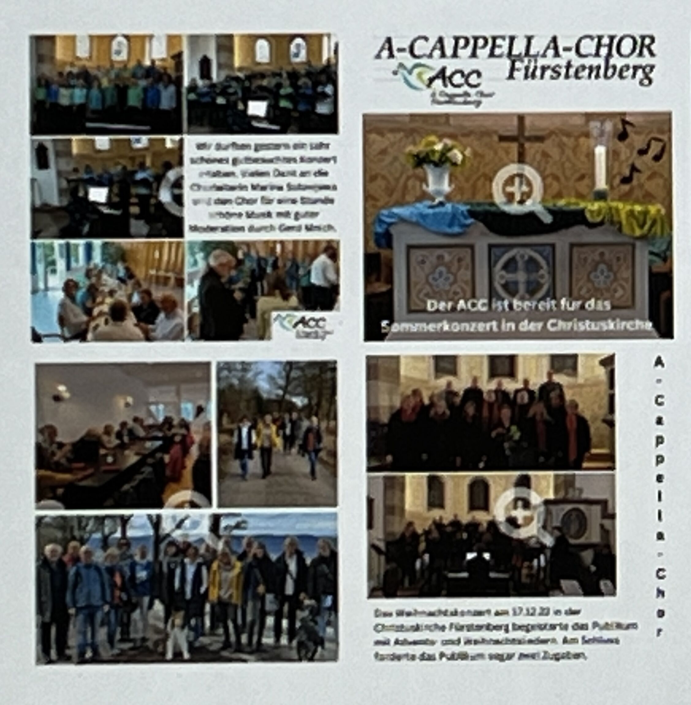 Der A-Cappella-Chor Fürstenberg wurde 1994 auf Initiative von Stefan Seizer, der Organist der Christuskirche in Fürstenberg war, ein weiterer Chor, neben dem damaligen Kirchenchor, gegründet. Sylvia Pfannschmidt, Pastorin der evangelischen Gemeinde seinerzeit, war große Befürworterin und selbstverständlich auch Mitsängerin. Noch heute singen im A-Cappella-Chor Gründungsmitglieder mit. Nachdem Stefan Seizer, der von 1994 bis zu seinem beruflichen Wohnortwechsel im Jahr 2000 den Chor aufgebaut und geleitet hat, übernahm Gerd Mnich, eh. Leiter der Höxteraner Realschule, kurzfristig die Leitung. Er war leidenschaftlicher Musiker und noch heute unterstützt er den Chor mit seiner Stimme und auch Instrumental. Seit 2011 leitet nun Marina Solowjewa den gemischten Chor in Fürstenberg. Das Repertoire umfasst mehrere Notenmappen und ist buntgemischt - von Chorälen bis hin zu Gospelsongs. Jedes Jahr begeistert der A-Cappella-Chor gleich mehrere Hundert Zuhörer bei seinen beiden Konzerten im Jahr (Sommer und Weihnachten). Besonders beliebt und sinnlich ist das jährliche Weihnachtskonzert.