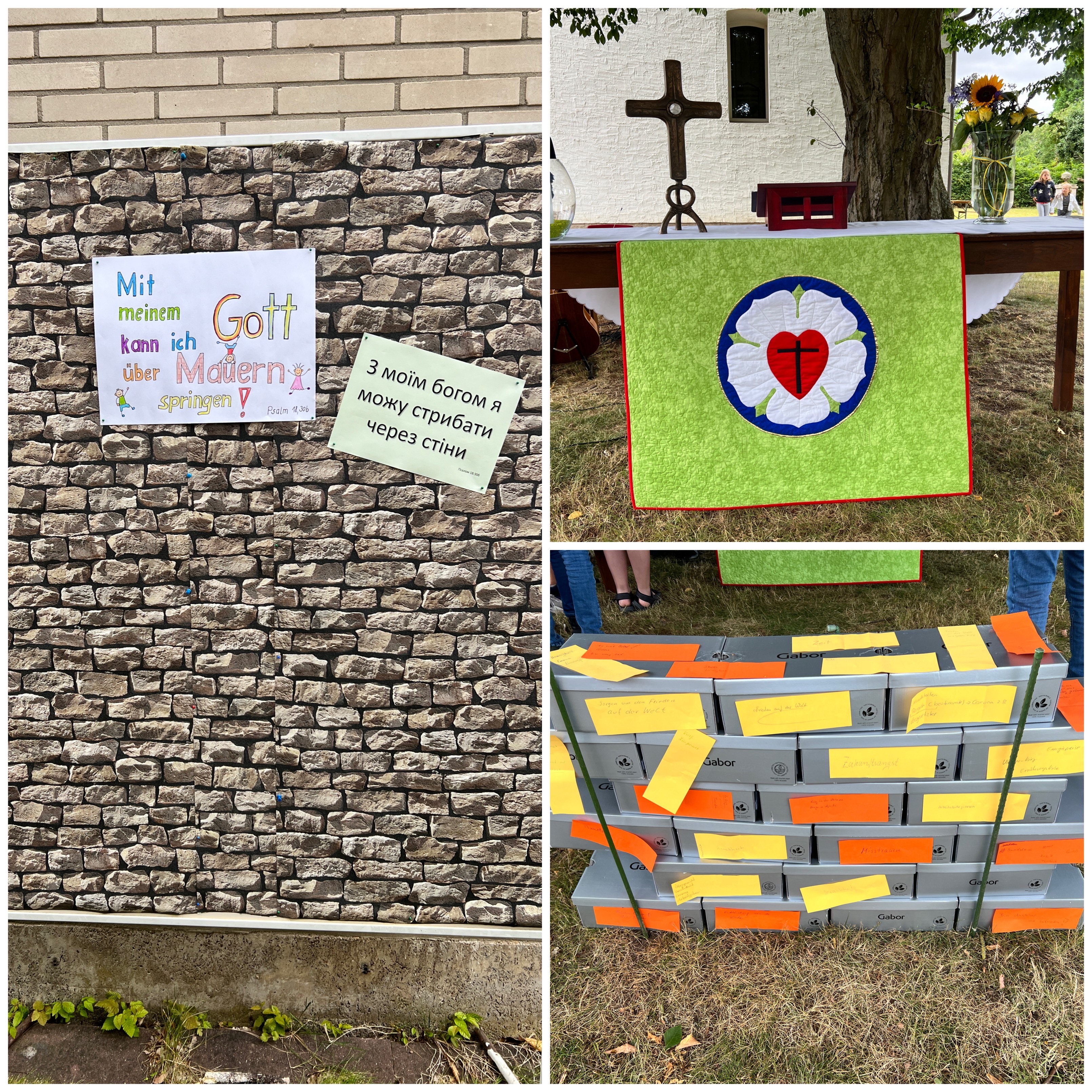 Der Gottesdienst fand bei windigem Wetter auf der Wiese neben der Kirche statt. Viele Besucher nahmen auf den bereitgestellten Bänken platz. Der Gottesdienst wurde von Pastor von Butler gestaltet und der Projektchor, unter der Leitung von Tabea Kayser, hat den Gottesdienst musikalisch unterstützt und bereichert. Bei der Lesung "David gegen Goliath" stellte der kleine Karl (eine Handpuppe) viele Fragen und die Lesung wurde dadurch lebendiger und für Kinder leichter zugänglich. Gemeinsam wurde gesungen und gebetet und die Gottesdienstbesucher konnten ihre "Steine" - Probleme, welche ihren Lebensweg beschweren und Mauern errichten - aufschreiben. Diese wurden auf eine gebastelte Mauer geklebt und die Kinder konnten erzählen, wie eine Mauer überwunden werden kann: durch Gemeinschaft - Hilfsbereitschaft - Nächstenliebe.