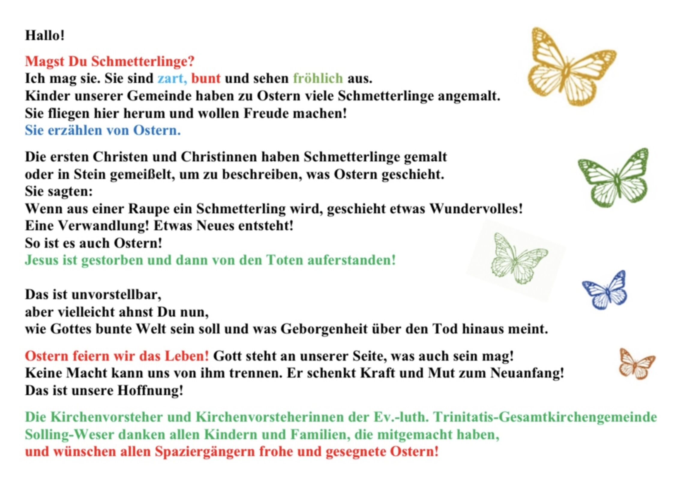 In Lauenförde schwebten die Schmetterlinge im Gottesdienst an Palmarum durch die Kirche. In Boffzen, Fürstenberg und Derental wurden sie zu verschiedenen Zeiten an die gespannten Leinen oder Sträucher gehängt. Beim Familiengottesdienst am Ostermontag flatterten die Schmetterlinge auch in Meinbrexen ein.