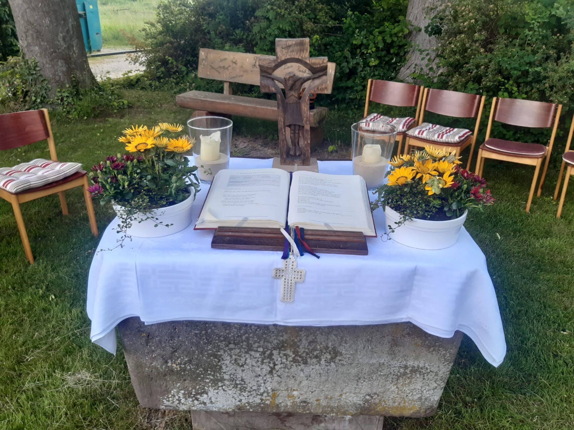 Beide Gottesdienste konnten dank des herrlichen Wetters, wie geplant, als Open-Air Gottesdienste mit anschließendem Umtrunk am Eichenstamm durchgeführt werden.