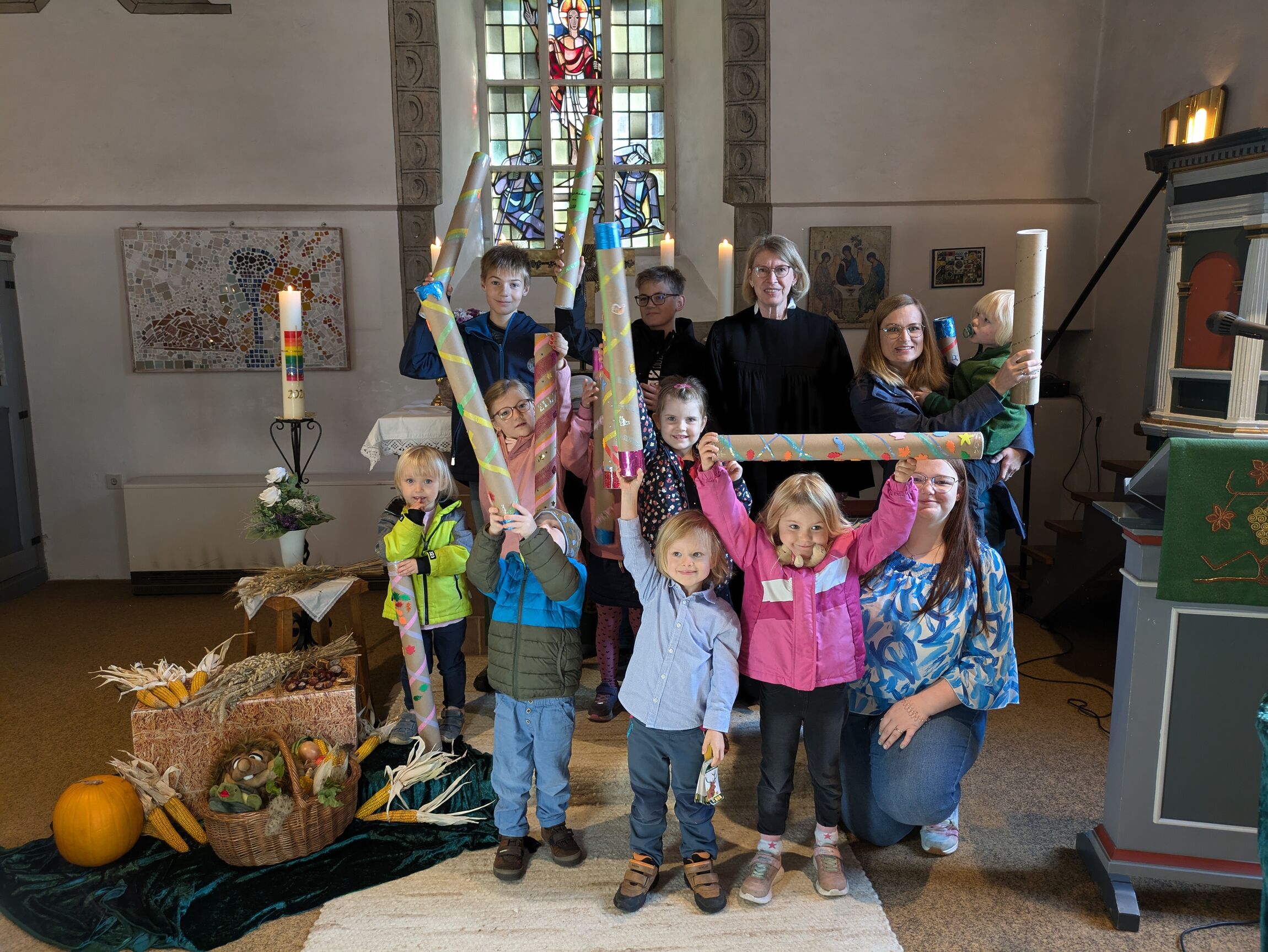 Nach einer herzlichen Begrüßung durch Pastorin Bertha Bolte-Wittchen erklangen die Regenmacher der Kinder erneut, diesmal sanft und leise. Gemeinsam sang die Gemeinde das beliebte Lied „Danke“ (Erntedank-Version) in sechs Strophen.