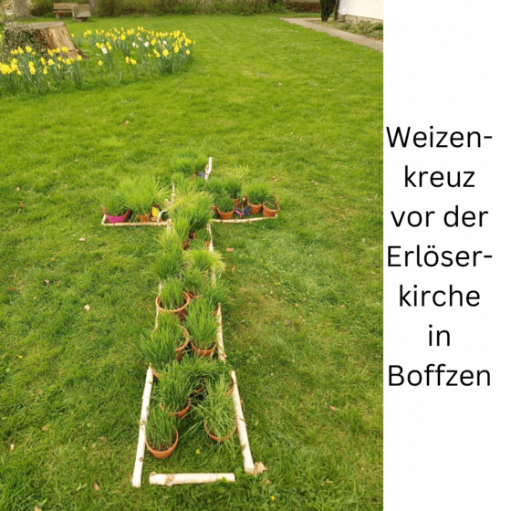 Die frischgrünen Weizentöpfe wurden jeweils zu einem Kreuz zusammengestellt, um an die Auferstehung von Jesus zu erinnern. Aus den Körnern, die wie tot wirken, wurde neues Leben! Jesus, der tot war, ist auferstanden!