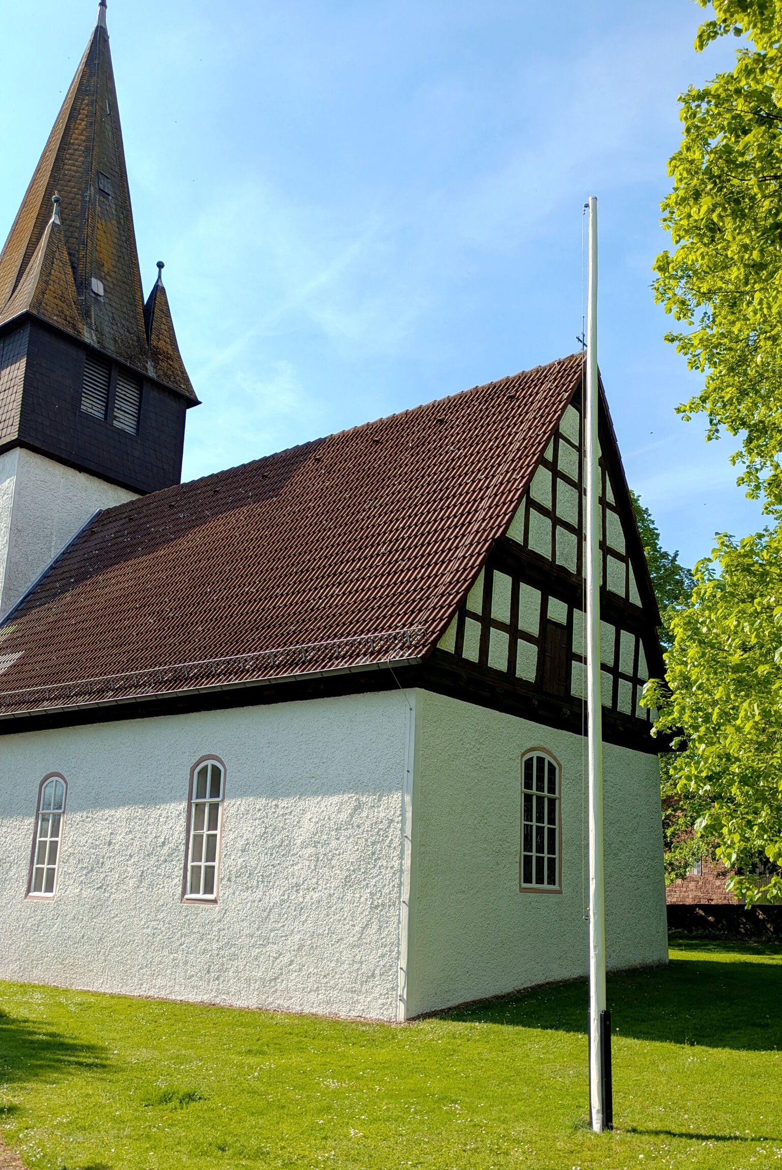 Mithilfe der Derentaler Montagsgruppe wurde eine Fichte aus dem Wald geholt, entastet, gehobelt und weiß gestrichen. Nachdem auch das Haltegestell neu lackiert und die Schrauben und der Seilzug instandgesetzt wurden, konnte die neue Stange vor der Kirche aufgerichtet und sicher befestigt werden.