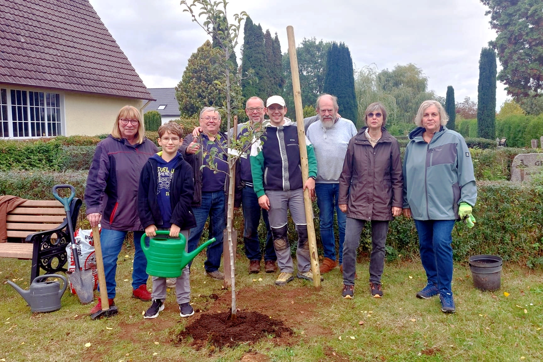 Nach aktuellen Empfehlungen der Landeskirche Hannover sind so wenig Schadstoffe in Bodenproben auf Friedhöfen zu finden, dass die Anpflanzungen von Obstbäumen und anderen Nutzpflanzen sogar wünschenswert sind und die Erträge auch verzehrt werden können. Am 11. Oktober trafen sich dafür zwei Gruppen und gruben mit Unterstützung von Torsten Wegener mit dem Erdbohrer die Pflanzlöcher.