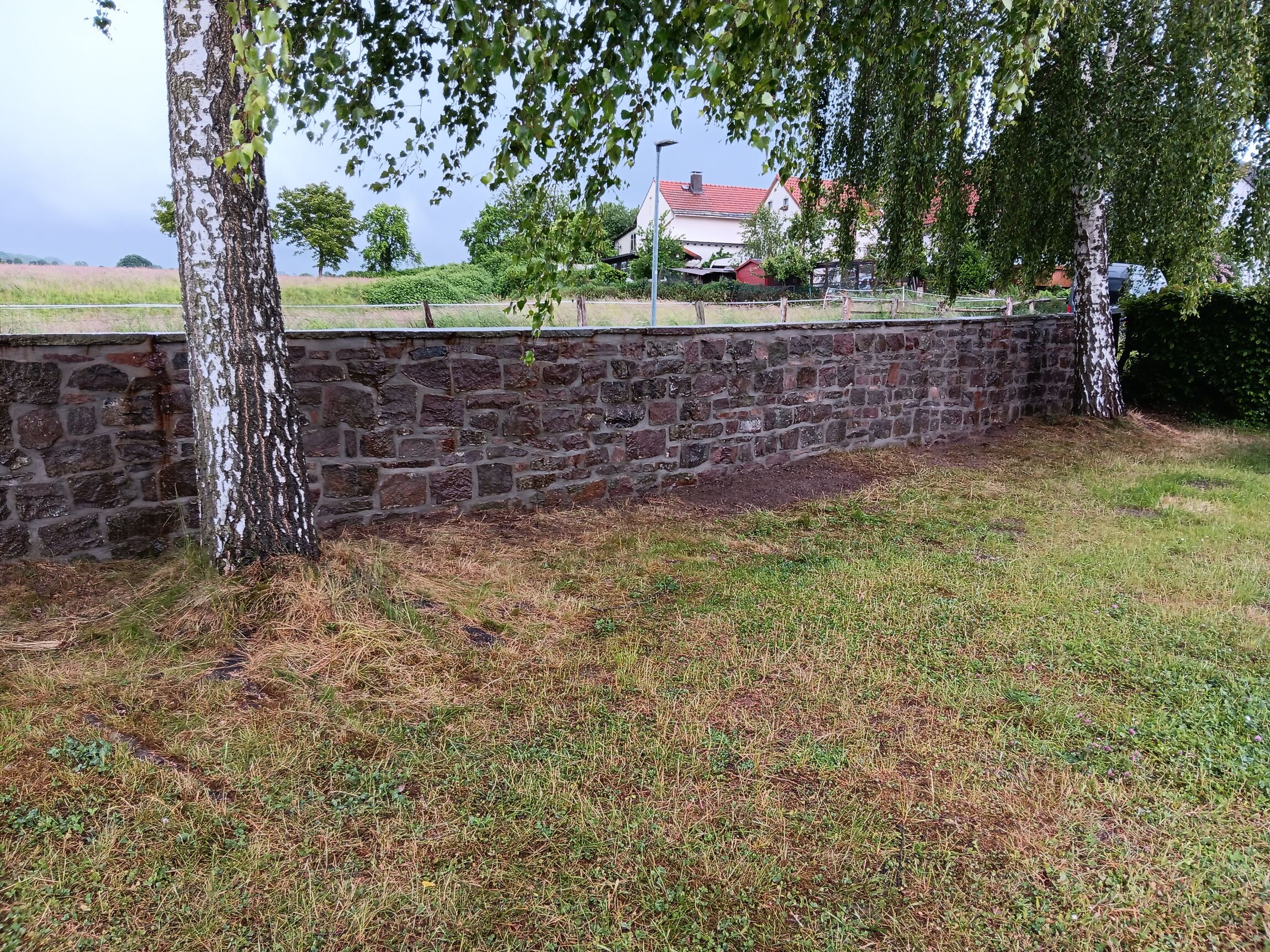 Zum Schutz und zur Abgrenzung wurde der neue Friedhof mit einer Mauer aus Buntsandstein eingefasst. Die Steine stammten aus dem örtlichen Steinbruch, verarbeitet von Maurern der Region. Doch obwohl das Mauerwerk solide ausgeführt wurde, fehlte es damals noch an einem haltbaren Mörtel. Über Jahrzehnte drangen Pflanzen und Feuchtigkeit in die Fugen, Wurzeln lockerten die Struktur und Frost sprengte kleinere Risse auf. Die Mauer war nicht einsturzgefährdet – aber stark sanierungsbedürftig. Der Zustand machte eine umfassende Erneuerung unumgänglich.