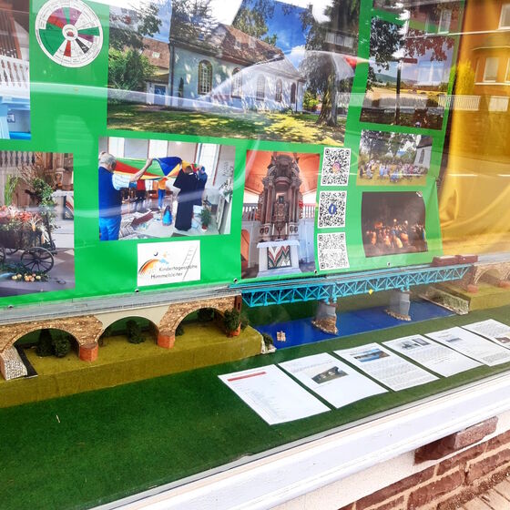 In dem einen Schaufenster finden Sie einen Nachbau der Kennedybrücke. Diese wurde von unserem Küster Michael Rüther ehrenamtlich in liebevoller Kleinarbeit gestaltet und gebaut. Ein echter Hingucker.
