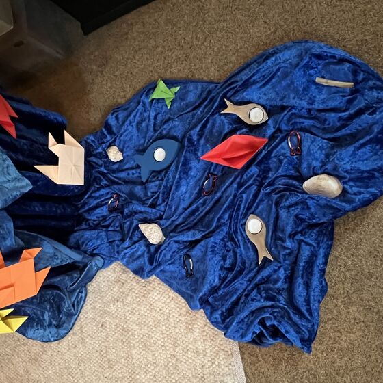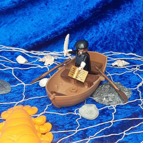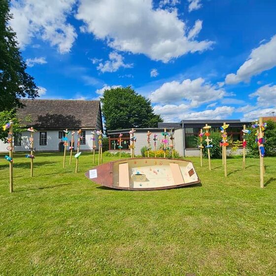 Auf dem Schulfest der Grundschule und auf dem Kindererlebnistag „Arche Noah“ der Kirchengemeinde haben Kinder Fische, Seepferdchen und Quallen bemalt, die nun um das Banner und das von Wilfried Hoffmeister gespendete Boot „herumschwimmen“.