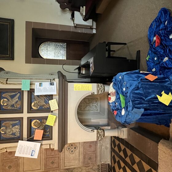 Wasser ist immer in Bewegung, es bahnt sich seinen Lauf. So erleben wir es tagtäglich mit dem Wasser der Weser. Symbolisch „läuft“ das Wasser der Taufe in der Christuskirche „über“. Blaue Tücher quillen aus einer gestalteten Mitte hervor wie ausströmendes Wasser. Es ist voller Leben, wie das Wasser der Taufe. Verbunden mit Gottes Segen will es im Leben der Getauften wirksam werden.