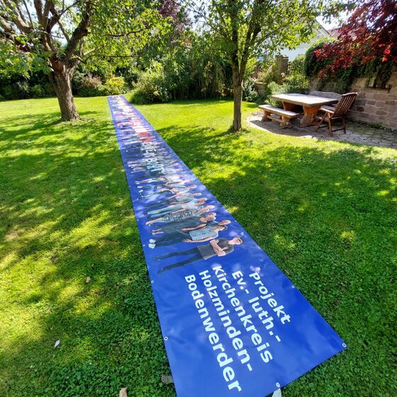79 Menschen aus Lauenförde machen auf einem Banner an der Kirche auf unser Projekt des Kirchenkreises „Wasser des Lebens“ aufmerksam. 15 Gruppen, Vereine und Einzelpersonen aus dem Sozialraum Lauenförde beteiligten sich an dem Kunstprojekt „In Sachen Wasser sitzen wir alle in einem Boot“: Der Bürgermeister mit Gemeinderat, das Team des Gemeindenachmittags „Kaffee Miteinander“, der Kirchenvorstand der St. Markuskirche, die Landfrauen, das Rote Kreuz, der Posaunenchor, der CVWB mit Prinzessin, die Fördervereine der Grundschule und der AWO-Kita, der Mittwochstanzclub, die Freiwillige Feuerwehr, der FC Blau-Weiß, die Turngemeinschaft, der Freizeitgärtnerverein, die Schützen und ein Schüttenhoffkamerad.