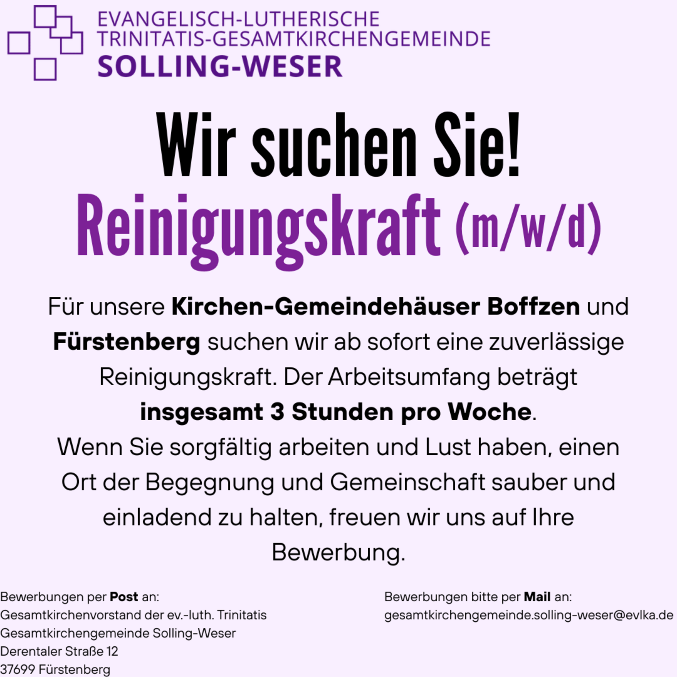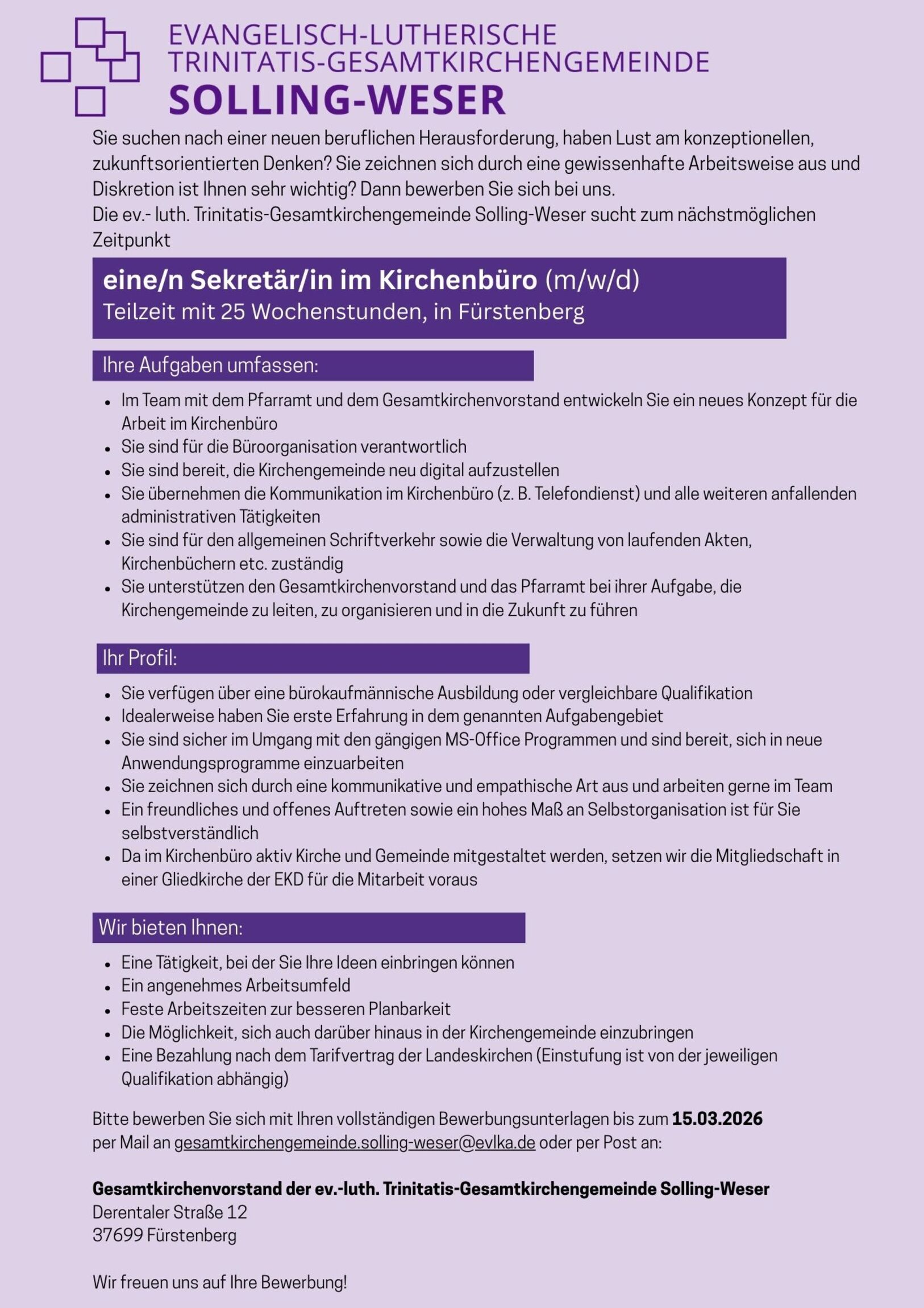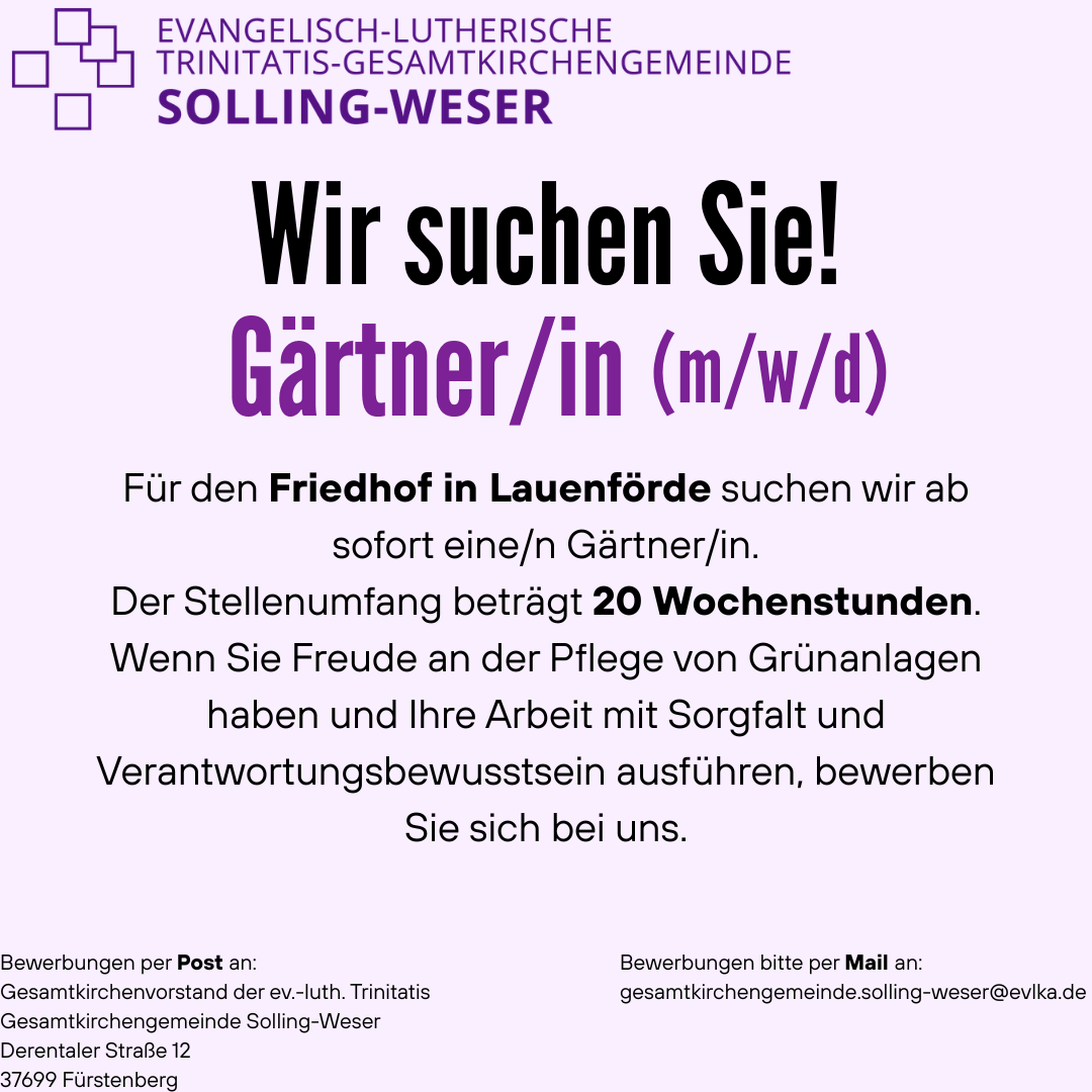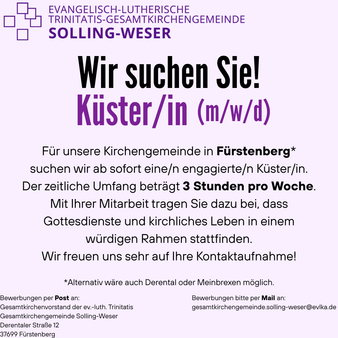 Wenn Sie sich für diese Tätigkeit interessieren, dann freuen wir uns über Ihre Kontaktaufnahme. Zeiten der Kirchenöffnung werden dann gemeinsam mit Ihnen besprochen.