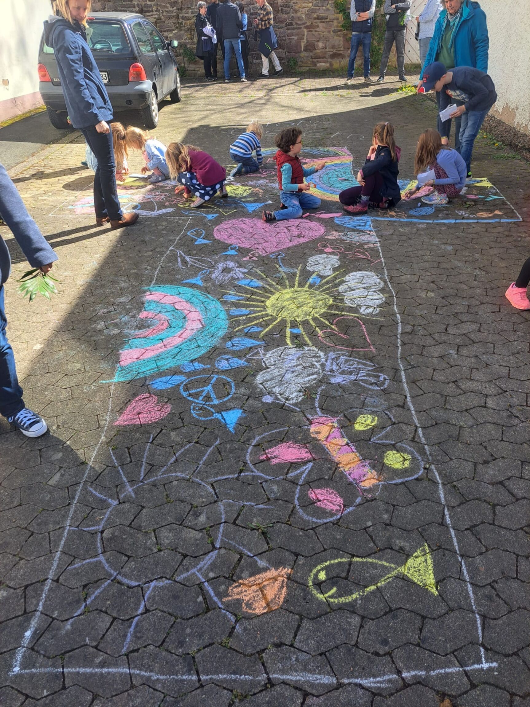 Unser Kirchenrabe Johannes erzählte uns von seinem Abenteuer, als er gefangen wurde und sich wie begraben fühlte und von der Freude, die er empfand, als er frei war. Sein “neues Leben” begann. An diesem Punkt schloss sich die Ostergeschichte an. Die Thematik Tod nur am Rande erwähnend, stand während des Gottesdienstes der wahre Kern von Ostern im Mittelpunkt. Die Auferstehung als Grundgedanke des Christentums. Auch was das alles mit dem Osterhasen zu tun hat, hat Lektorin Bähre für alle Gottesdienstbesucher, ob klein oder groß, in ihrer Predigt verdeutlicht. Im Anschluss des Gottesdienstes fand die diesjährige Osteraktion statt und der eher trostlose graue Vorplatz der Kirche wurde farbenfroh bemalt und strahlt neues Leben aus.