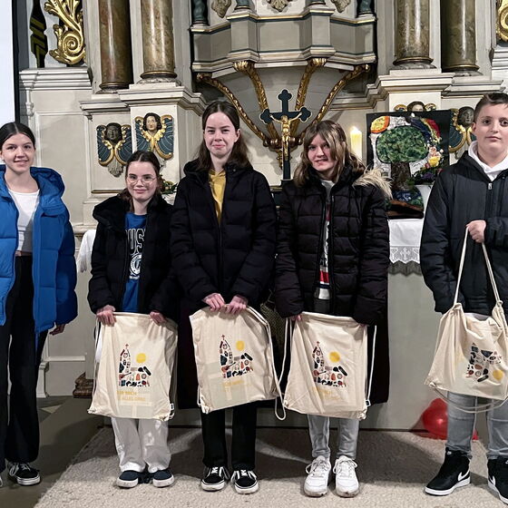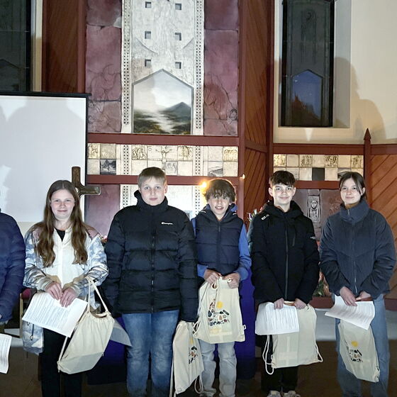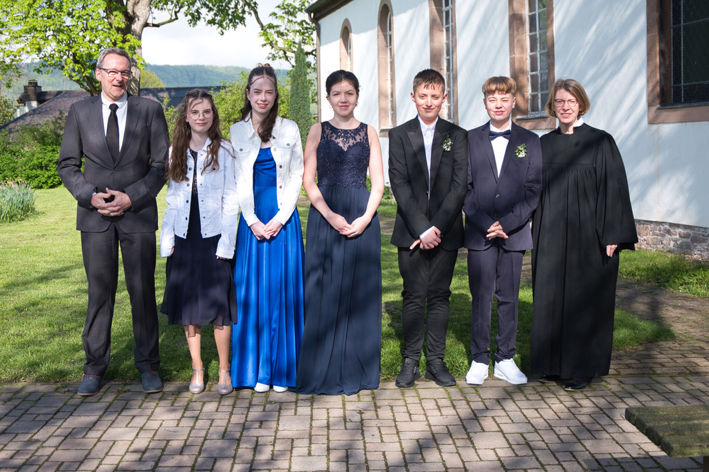 v.l.n.r.: Diakon Dierk Stelter, Kaja Pfannkuche, Lena Pfannkuche, Paula Kleine, Nico Peters, Jonas Gelsdorf und Pastorin Bertha Bolte-Wittchen