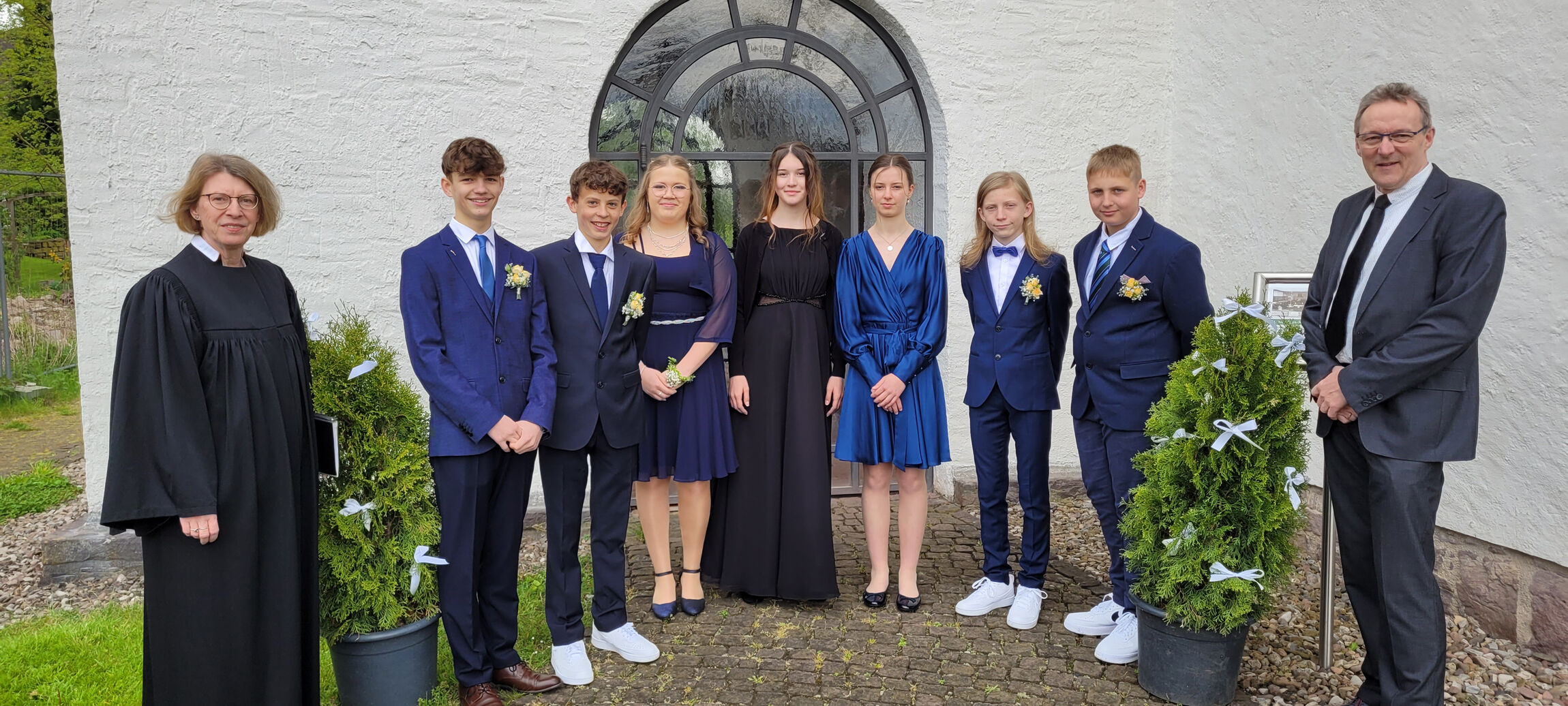 v.l.n.r.: Pastorin Bertha Bolte-Wittchen, Miika Teemu Piljug, Hinnerk Meyer, Darleen Schmidt, Leni Wiegmann, Gesa Scharnberg, Lian Steingrebe, Michel Hirsch und Diakon Dierk Stelter