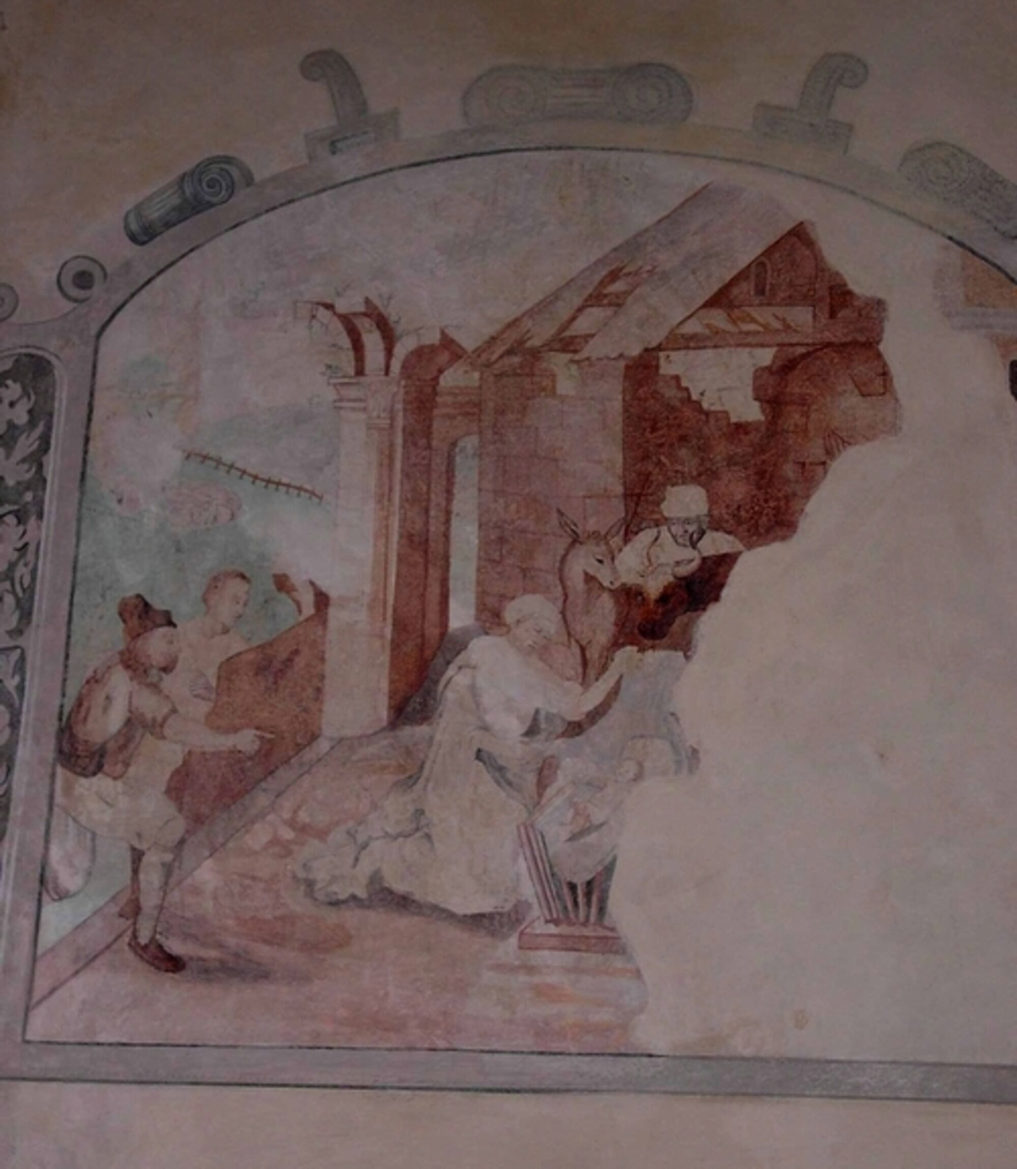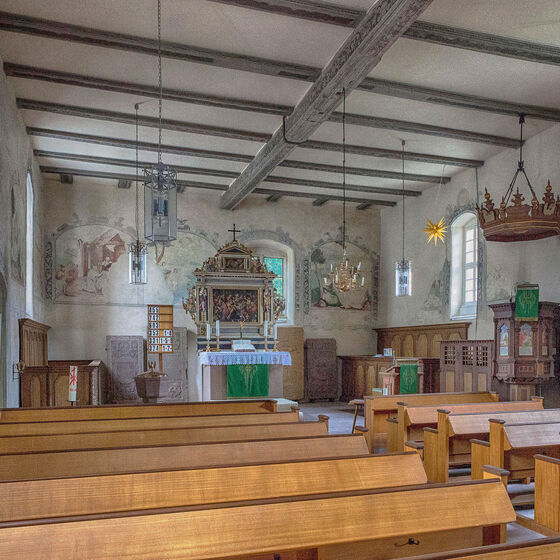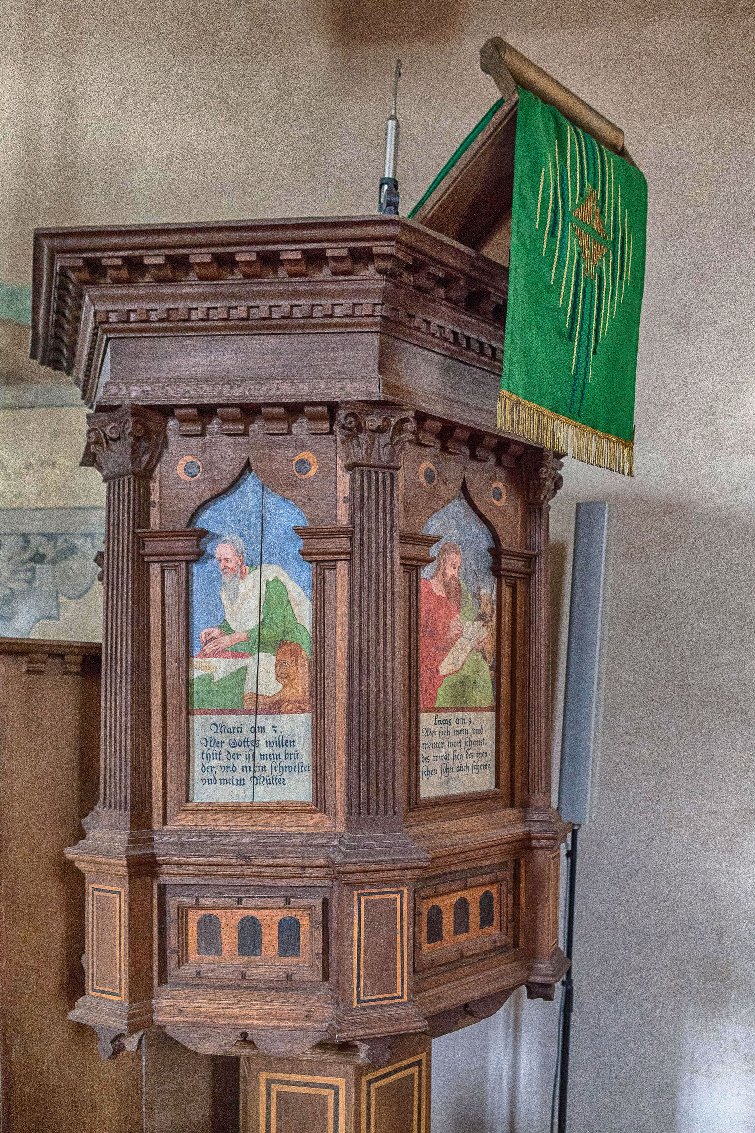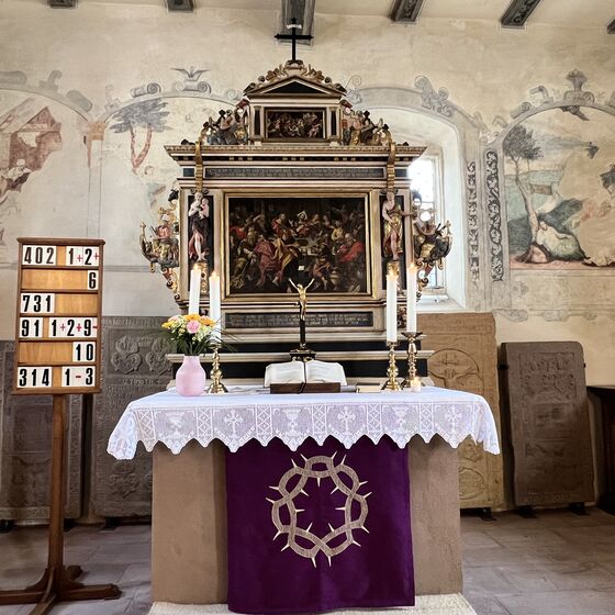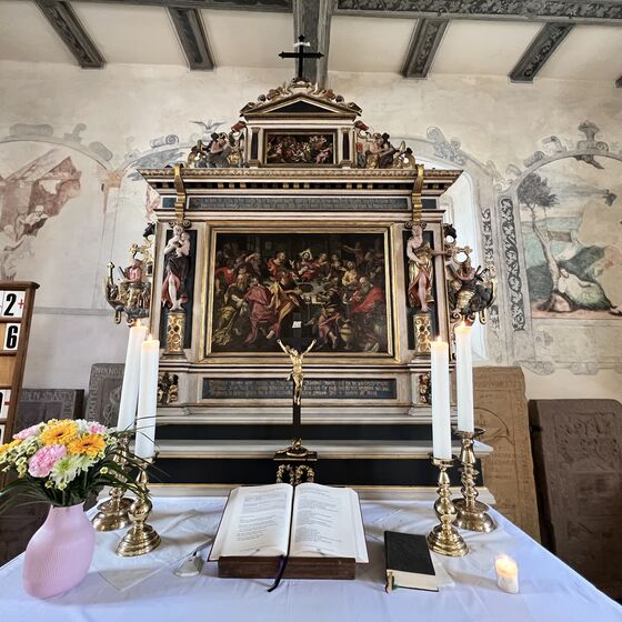 Umrahmt von den Figuren der schreibenden Evangelisten mit ihren apokalyptischen Symboltieren (Offenbarung 4, 7) und zwei Frauengestalten, christliche Tugend verkörpernd, rückt der Altaraufsatz das Geschehen des Gründonnerstags in den Mittelpunkt.