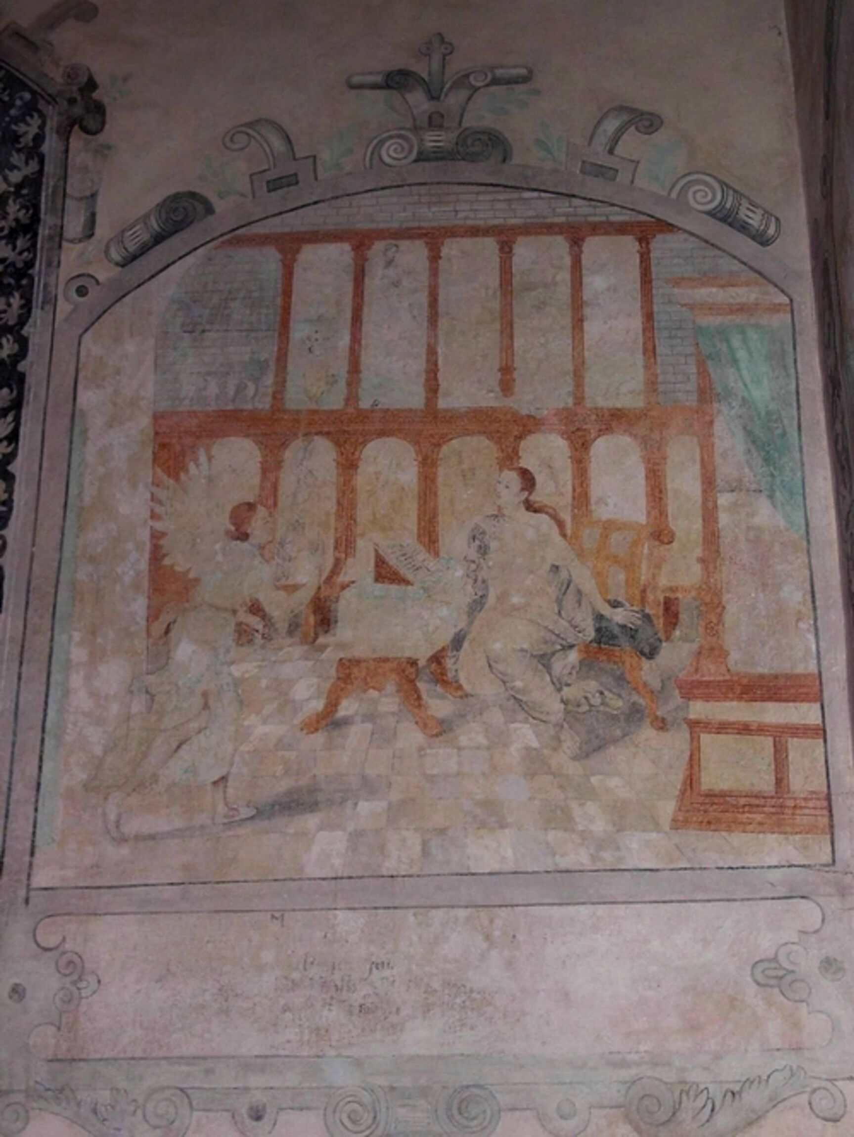 Die miniaturhafte Abbildung der nur beim Evangelisten Johannes (Johannes 13, 1-20) überlieferten Fußwaschung im oberen Teil des Altars, korrespondiert mit der Darstellung des Abendmahles (Markus 14, 12-25) im unteren. Die Jünger werden dort mit dem Vorwurf des Verrates konfrontiert, worauf sie mit entsetztem Fragen reagieren : "Bin ich´s ?". Im Vordergrund ist mit dem Geldbeutel Judas Ischarioth abgebildet. Auffällig ist die besonders üppige, naturalistische Darstellung des Passah-Mahles.